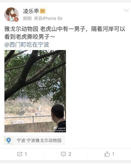 今天下午,宁波一野生动物园发生老虎咬人事件:围观者称游客近距离逗虎时被老虎咬入园内,随后工作人员用鞭炮驱虎。
