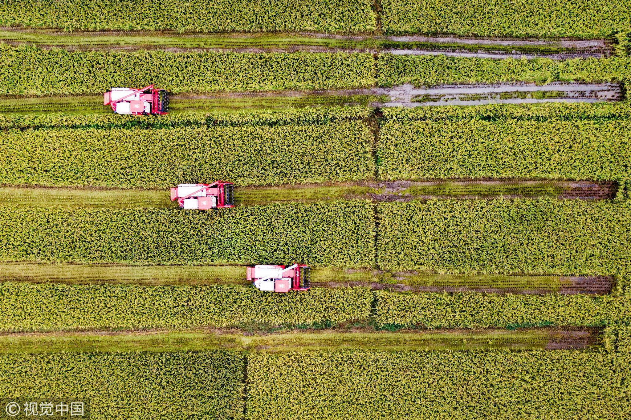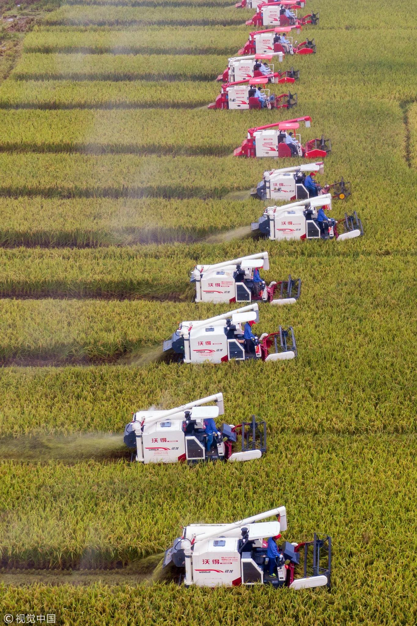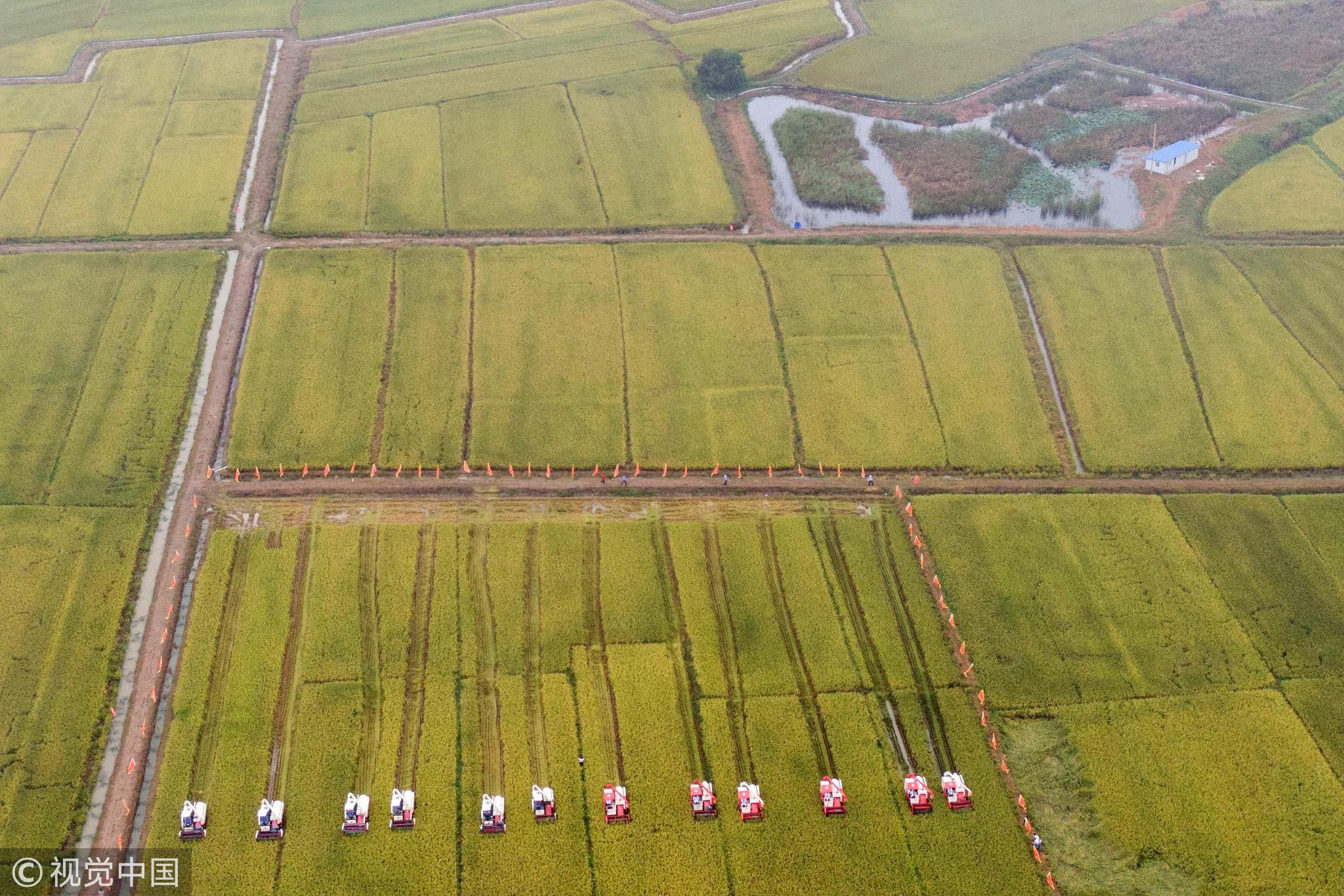 9月20日.江苏淮安盱眙县黄花塘镇新铺村虾稻共生示范基地内.数十台收割机踏着大地的音符穿梭在金黄的稻田里收割龙虾香米.在首届中国农民丰收节前夕“绘就"一幅美丽的秋收图