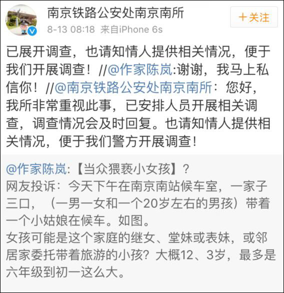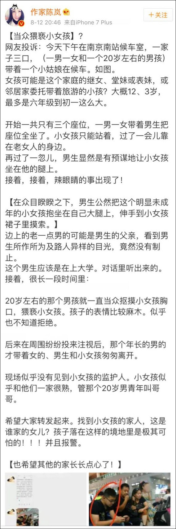 有网友爆料:8月12日下午19:10分的南京南站候车室,一男一女和一个20岁左右的男孩,带着一个小姑娘在候车。
