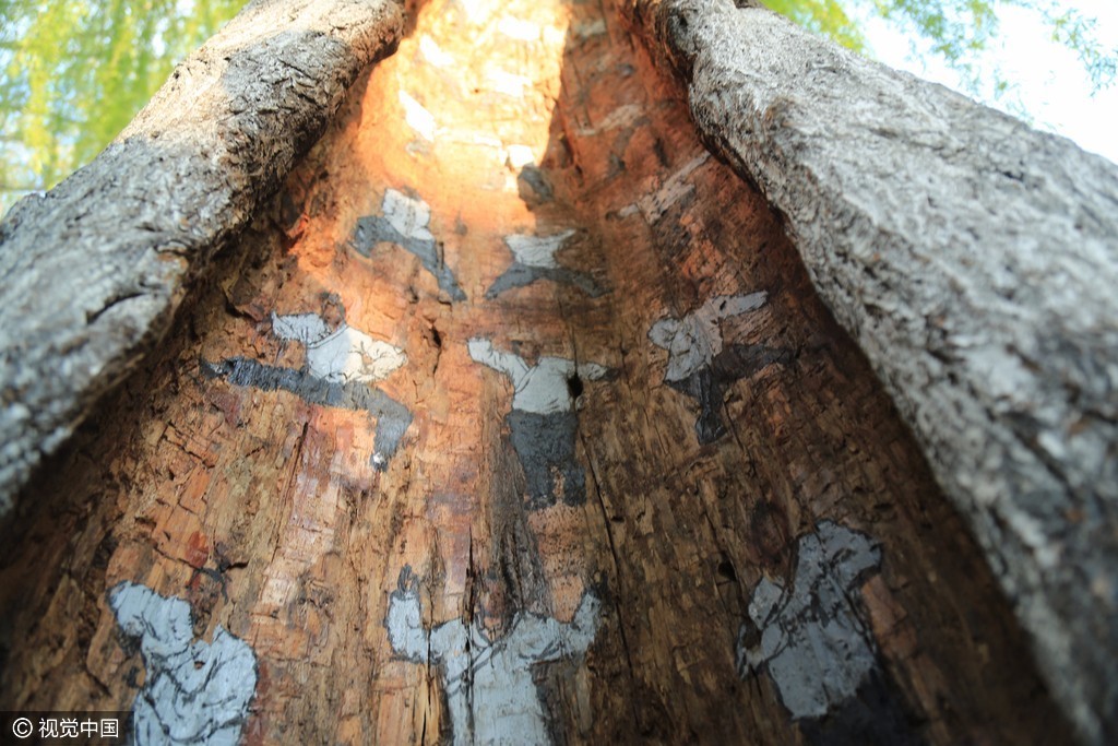 2017年3月27日,山东济南,大明湖遐园一处树洞内现手绘“武功秘籍”,人物惟妙惟肖,栩栩如生,招式炉火纯青,登峰造极,引游人围观。