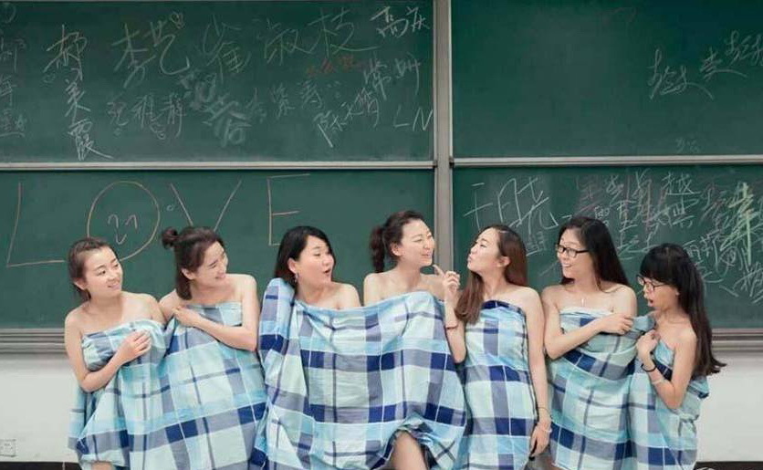 三条床单裹身,透露出大学四年闺蜜无间、宿舍友谊。