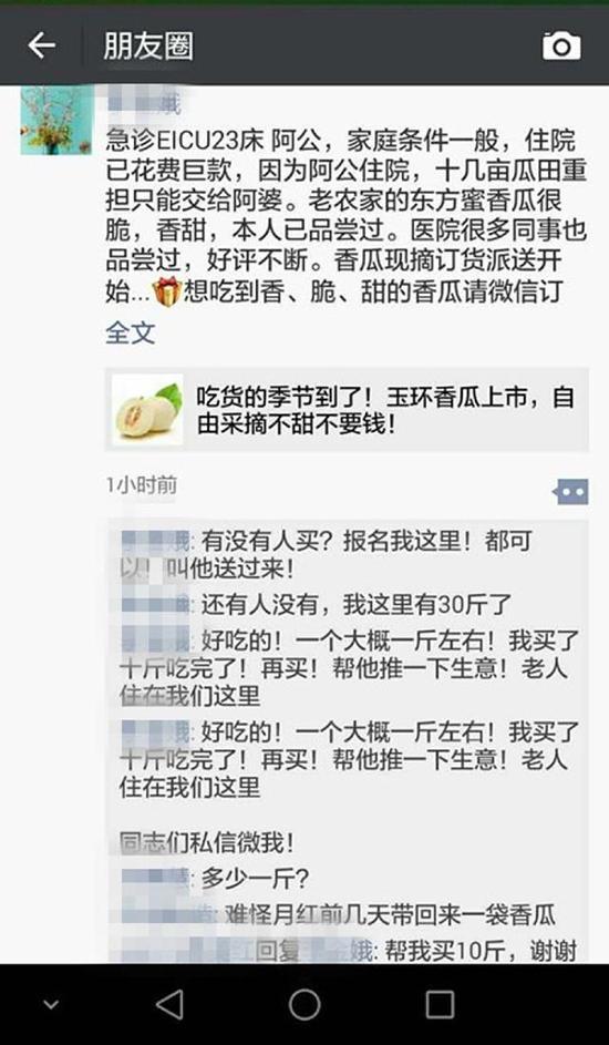 接下来发生的事情,老毛自己都没想到:医生护士们了解情况后,在朋友圈里推销起了香瓜,短短4天,卖掉了5000多斤。
