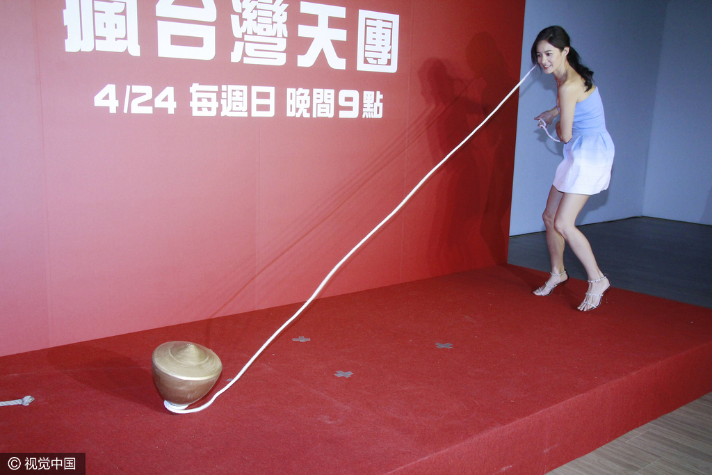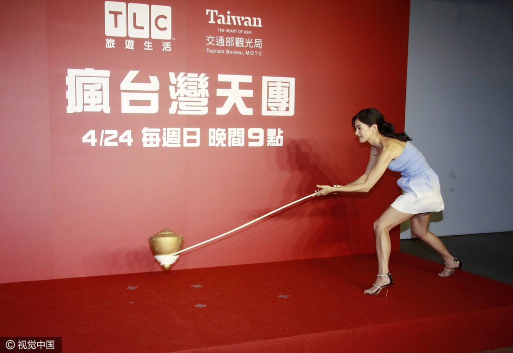台湾美女主持Janet18日出席《疯台湾》系列节目全新一季《疯台湾天团》开播记者会,记者会上她穿低胸洋装打起陀螺还有模有样。