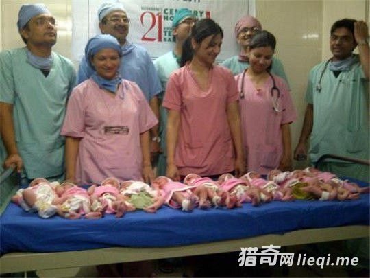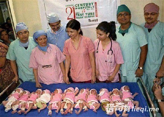 据报道称,在印度的苏拉特市,一名超级孕妇一次产下了十一名婴儿 ! 这到底是真的还是图中的照片经过了加工 ? 有知情人士表示,照片中的十一个婴儿确实都出生在同一天,也就是 2011 年的。