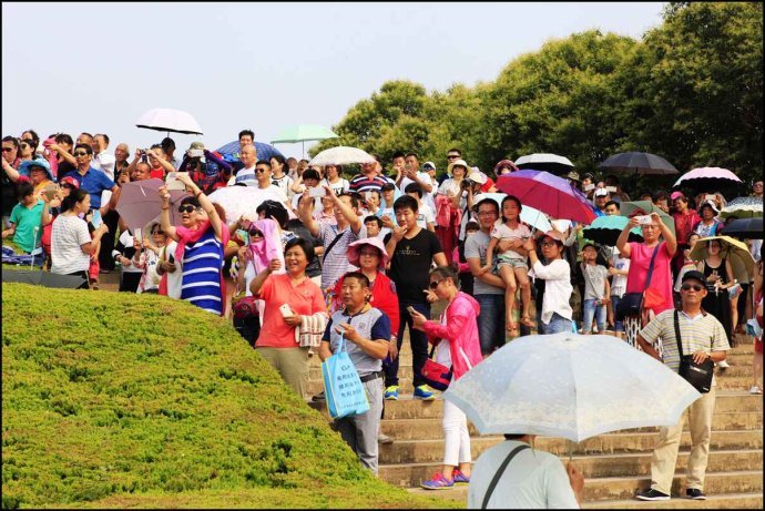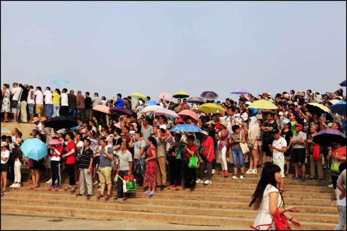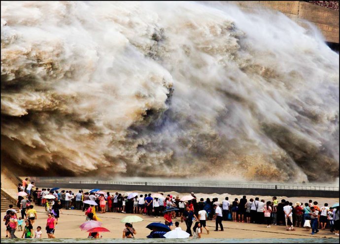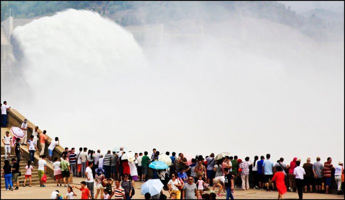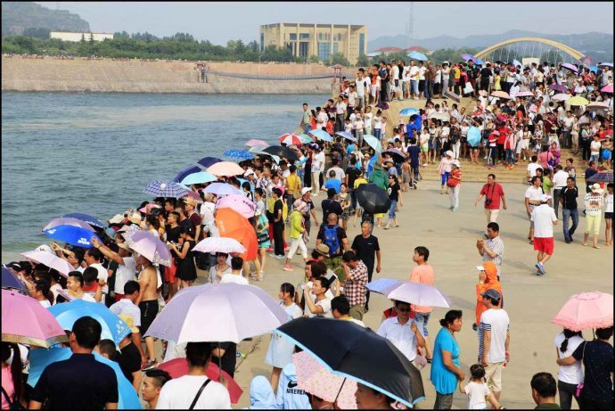 以下是在小浪底现场,万人争睹调水调沙壮观场面的情景