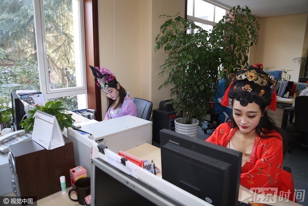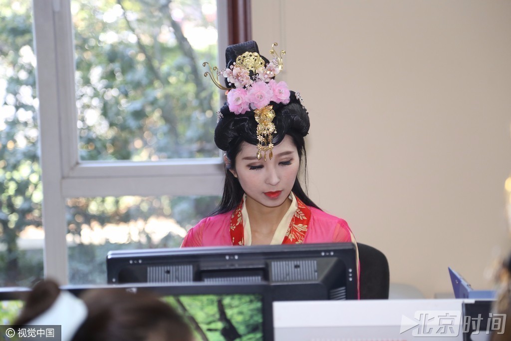 杭州,某景区上演了最穿越的上班,无论是景区的售票员、检票员、工作人员,还是办公室的行政人员,全都穿上了古装在自己的工作岗位上忙碌。