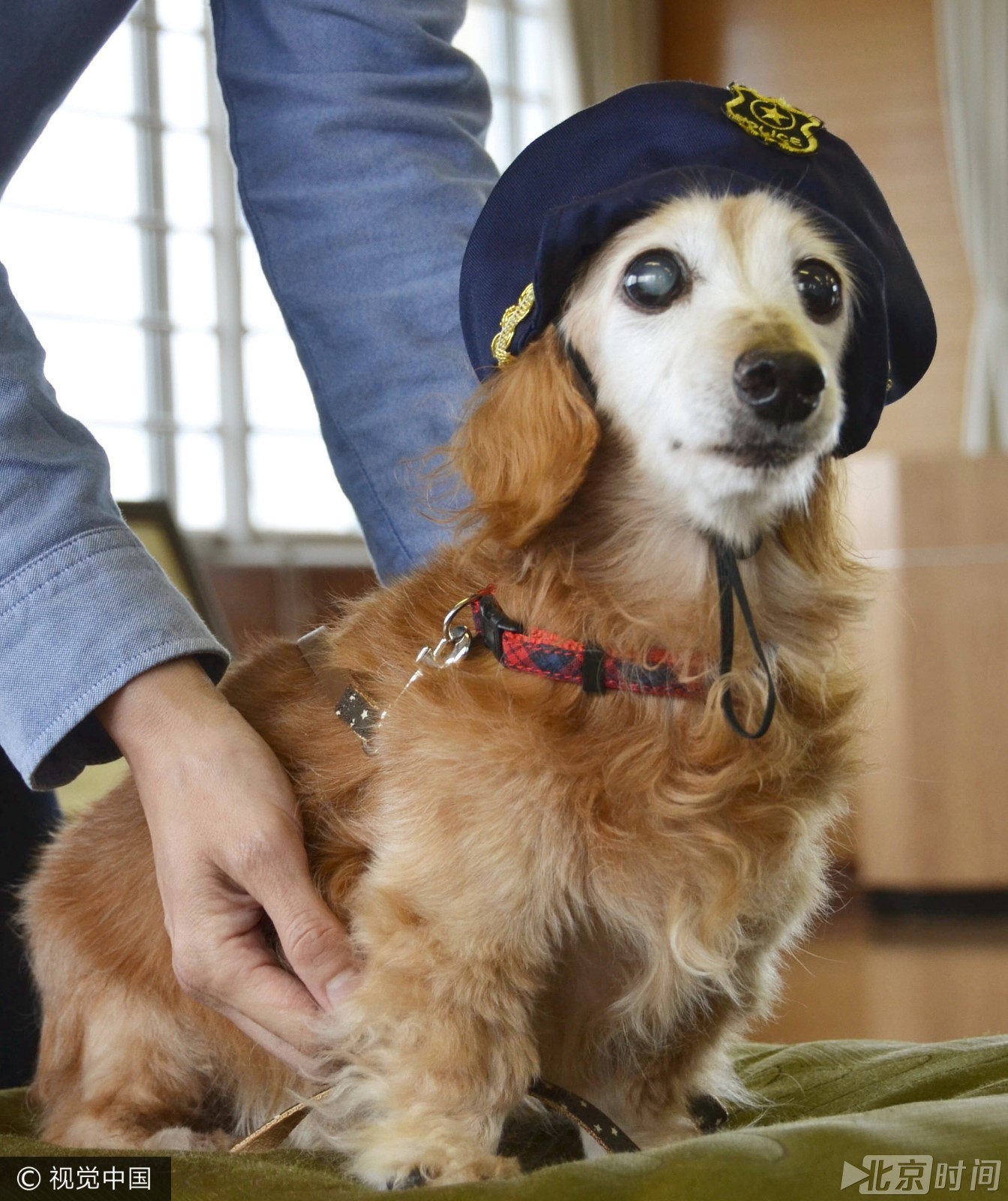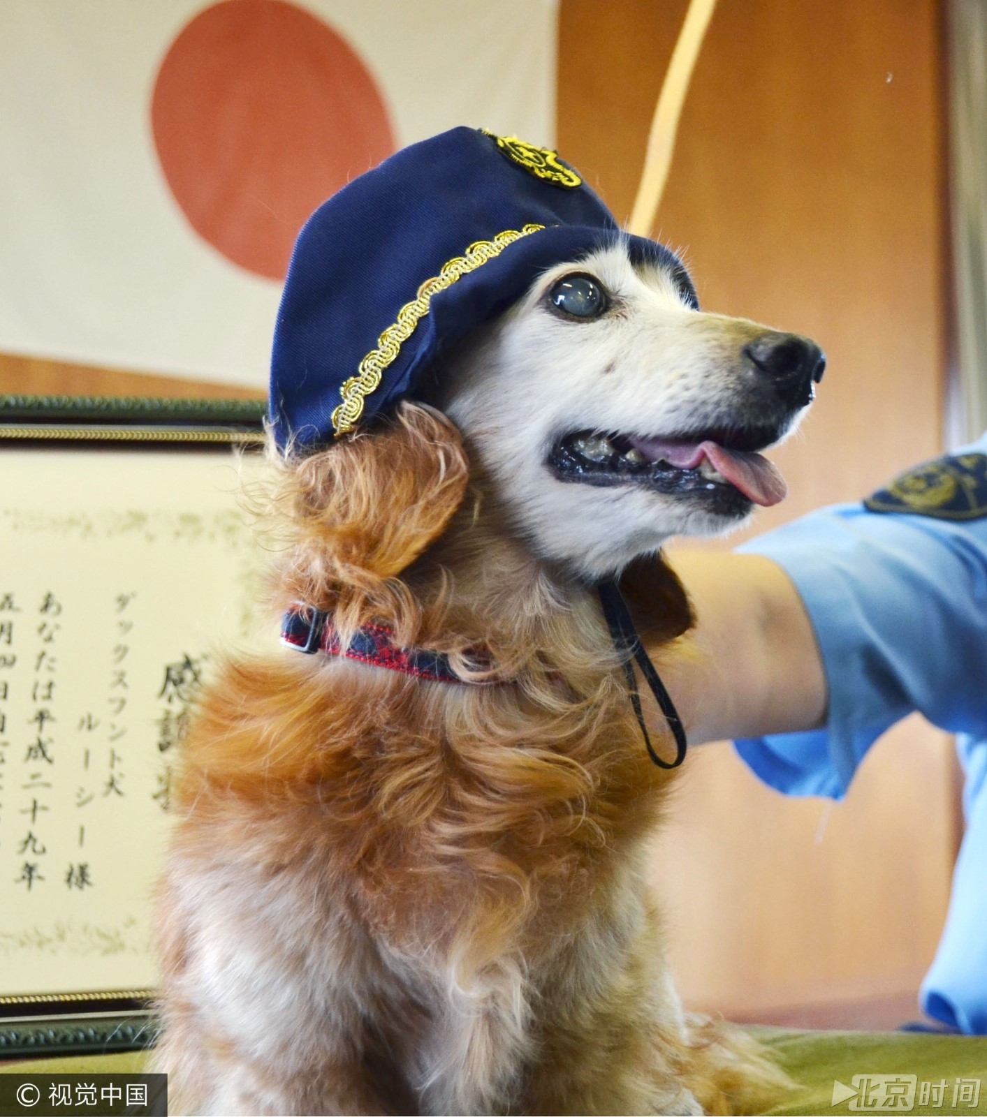 17岁的达克斯猎狗露西接受滑川市警局颁发的嘉许状。