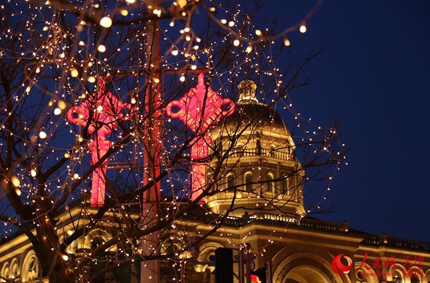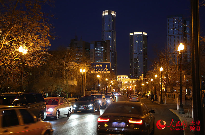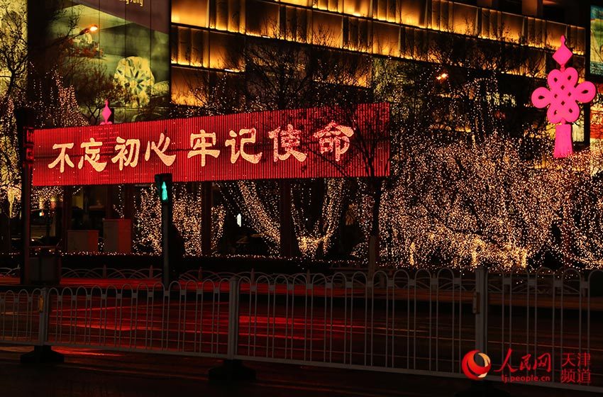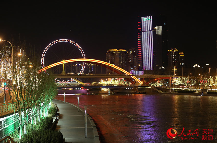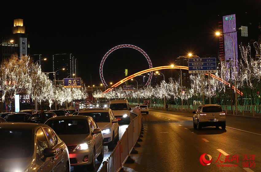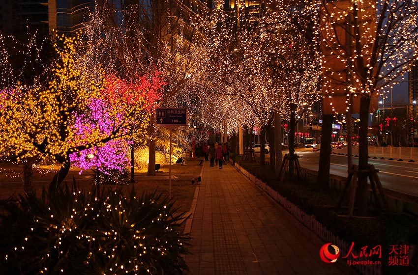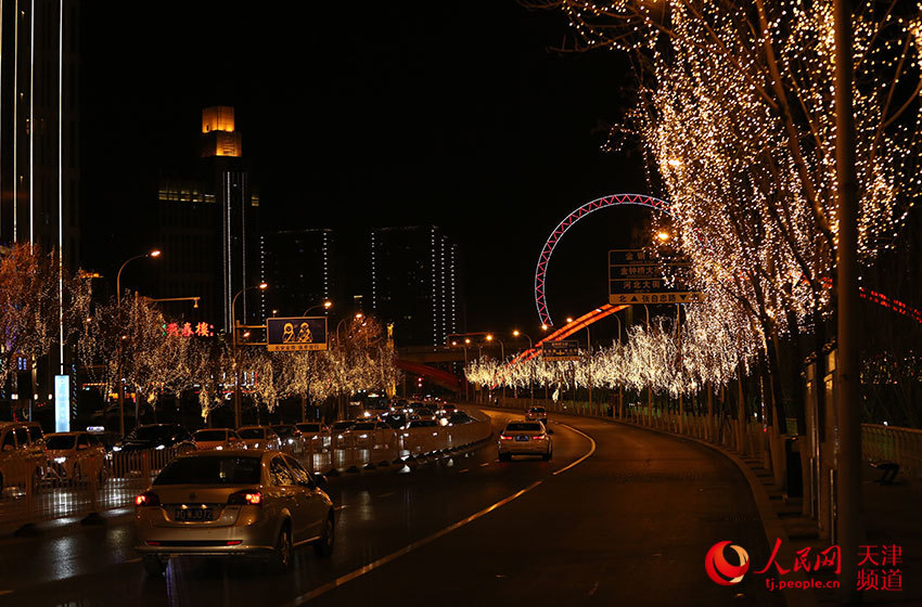 除夕夜,天津主要道路两侧精心布置缤纷多彩的亮化景观,福字、中国结、树挂串灯……一眼望去流光溢彩、璀璨夺目。