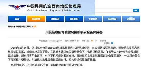 2018年5月14日,川航3U8633重庆-拉萨航班,在成都区域巡航阶段,驾驶舱右座前风挡玻璃破裂脱落,机组实施紧急下降。
