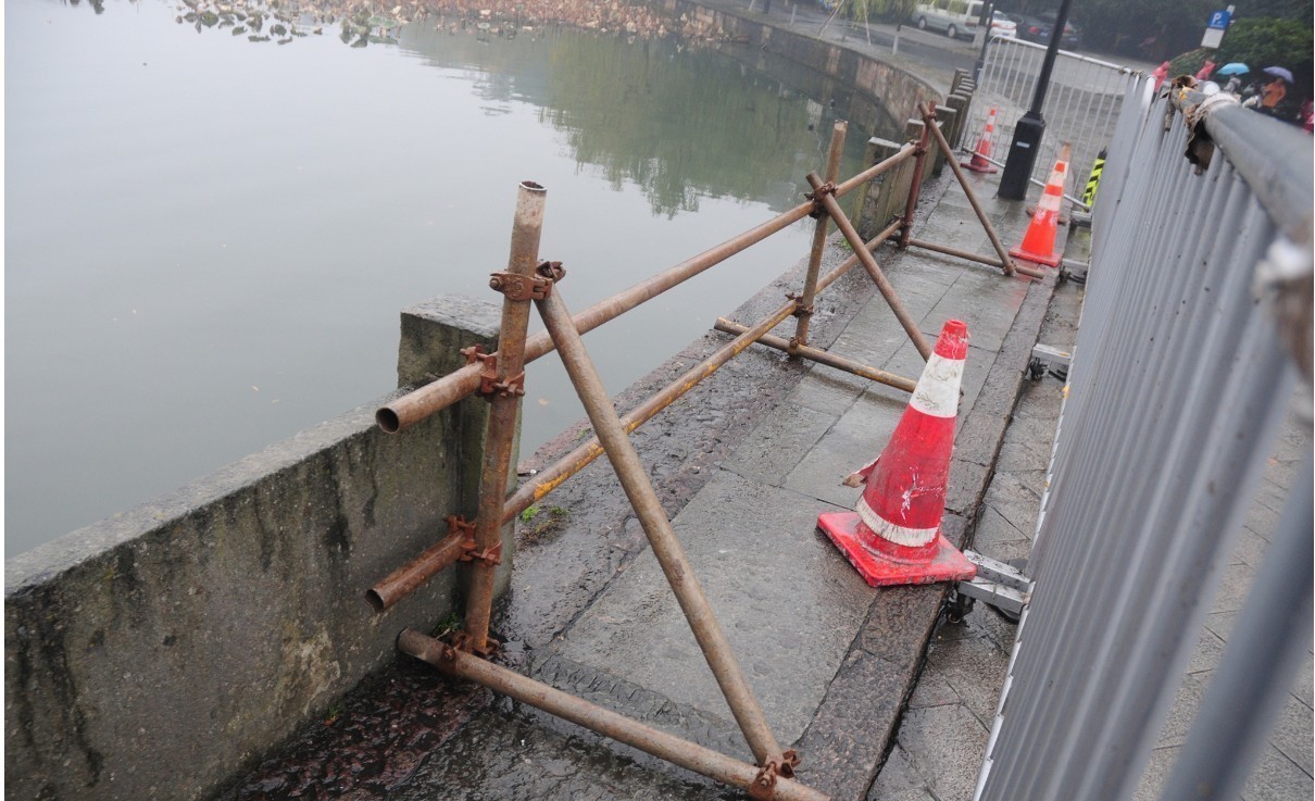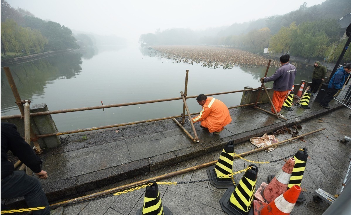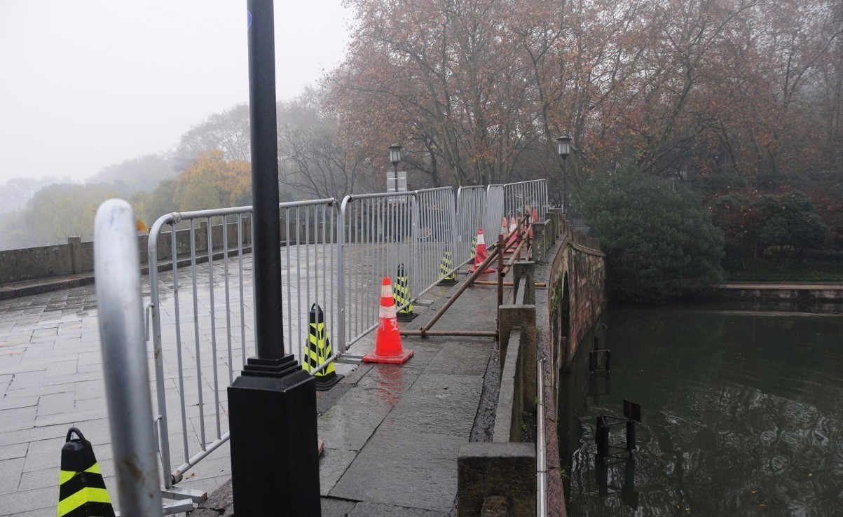 2016年12月20日,浙江省杭州市,杭州路政人员在被撞断的西湖西泠桥栏杆外架设围栏。