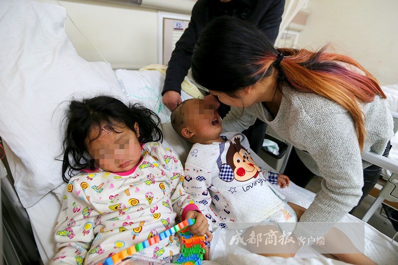 4岁的姐姐露露和两岁的弟弟浩浩躺在简阳市人民医院的病床上,满脸鲜血,头顶上有明显窟窿。