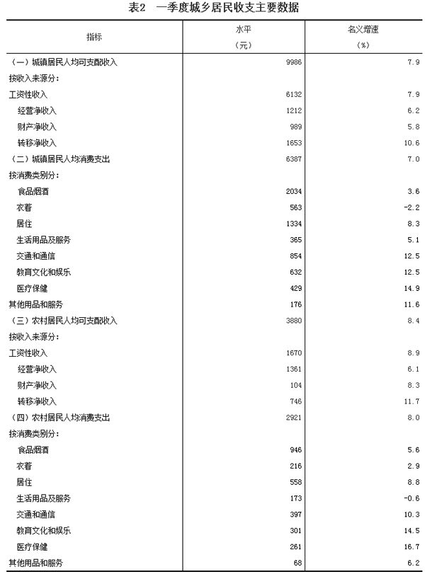 一季度,全国居民人均可支配收入7184元,比上年同期名义增长8.5%,扣除价格因素,实际增长7.0%。