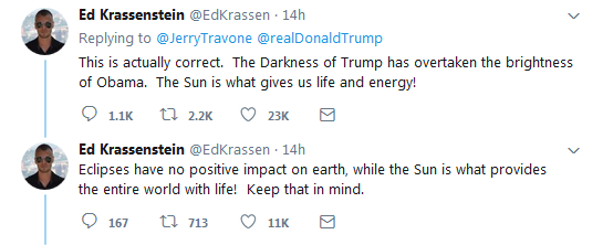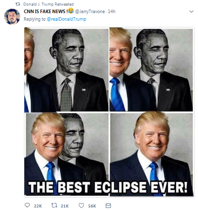 8月25日,美国总统特朗普又在推特上转发了一组令世人惊呆的表情包,并配以文字“有史以来最好的日全食”。