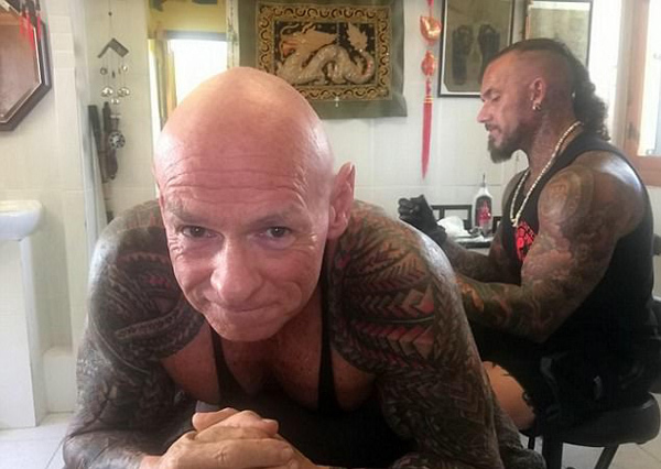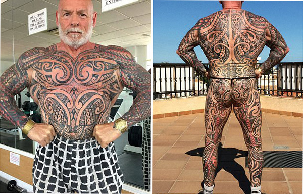 来自英国曼彻斯特市的59岁男健美运动员雷•霍顿 ,花费了5500英镑 ,近200个小时为全身文身。他认为文身可以使自己看起来更加年轻。