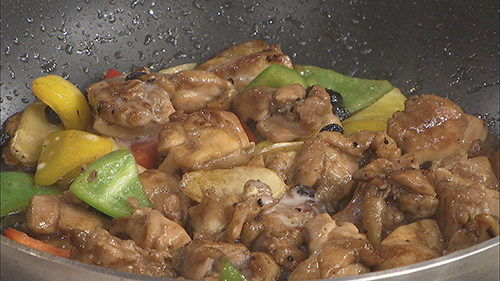 步骤3:仔姜煎到两面焦黄后,下入滑好的鸡块和切好的彩椒翻炒均匀,最后勾入芡汁出锅即可。