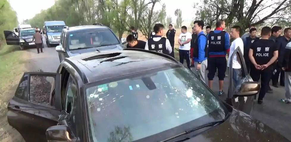 5月11日6时15分,可疑宝马车接近作案车辆,从宝马车上下来一名嫌疑人驾驶作案车辆,两车沿怀仁县马毛乡道由西向东快速逃离现场。现场指挥立即命令所有抓捕组追击堵截。图为解救人质现场。