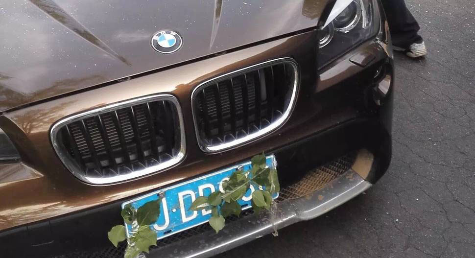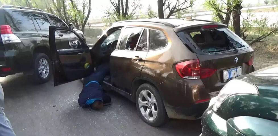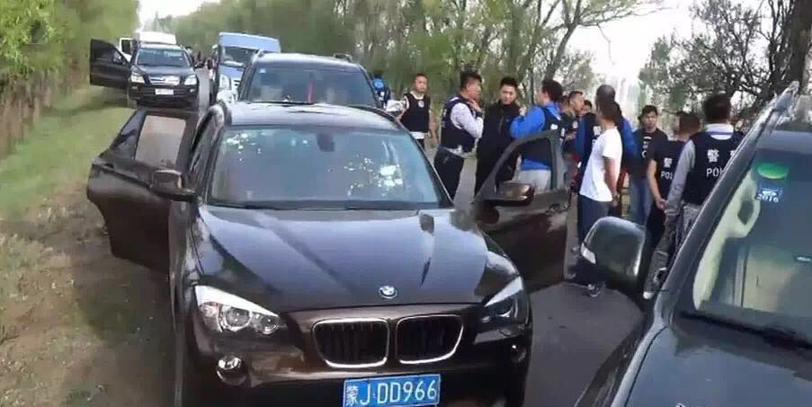 由于该车太阳膜较暗,从两侧无法看清车内情况,考虑到人质在车上,现场指挥当即下令不要开枪,并派侦查员以车为掩护,侦查到前侧只有1名嫌疑人时,下令从侧面向司机谨慎开枪,并不断喊话“别顽抗了,把枪扔出来,下车!”。犯罪嫌疑人穷凶极恶,负隅顽抗,拒不下车,不停向民警开枪,被民警用狙击步枪击毙,人质成功解救。图为解救人质现场,枪战结束后,宝马车门上满是弹孔。