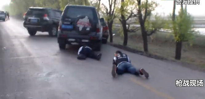 行驶不到500米,双环车被逼停,民警迅速将嫌疑车辆驾驶室玻璃砸破时,发现嫌疑人正在掏枪。在向副驾驶位置射击一枪后弃车逃跑,同时不断向民警开枪。民警果断还击,嫌疑人被击倒后仍垂死挣扎,继续向民警射击,最终被击毙。图为嫌疑人被击毙现场。