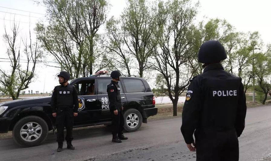 5月10日23时50分,在目标区域设卡盘查时,又发现一辆遮挡车牌强行冲卡的宝马越野车十分可疑。5月11日5时30分许,经过专案组民警分析研判,发现受害人轨迹出现在怀仁县毛皂镇一带。指挥部当即下达指令,由局领导亲自带领10个抓捕小组对毛皂镇进行秘密合围排查。图为山西大同怀仁县毛皂村,特警在公路上执勤。