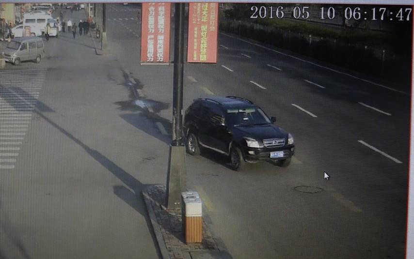 2016年5月10日12时30分许,大同市公安局接到报案,称某公司董事长被绑架,并遭索要2000万美元赎金。在实施解救人质计划时,引发长达20多分钟的激烈枪战。嫌疑人不断向民警开枪,民警果断还击,嫌疑人被击倒后仍垂死挣扎,继续向民警射击,最终被击毙。图为5月10日6时17分,嫌疑车辆途经受害人公司,在其办公楼右转,停靠在北都街与御河西路十字路口西南角。经视频侦查,晋BP1836黑色双环越野车自3月22日至5月10日在案发现场附近出现18次之多,其中5月7日、5月8日、5月9日连续三天早上6点左右,在案发现场至少停留2小时以上。