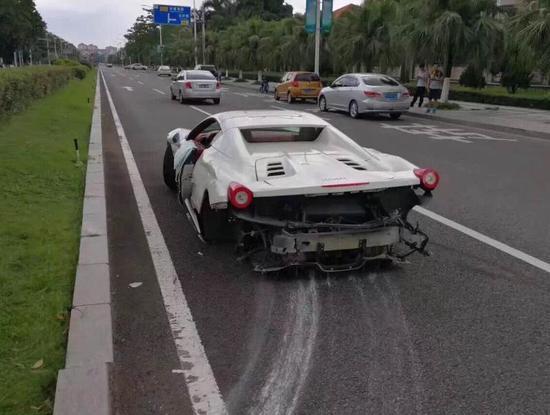 法拉利跑车受损最严重,右车身已撞得凹进去,车身严重变形,车尾外壳呈现“撕裂”状,裸露出零部件。