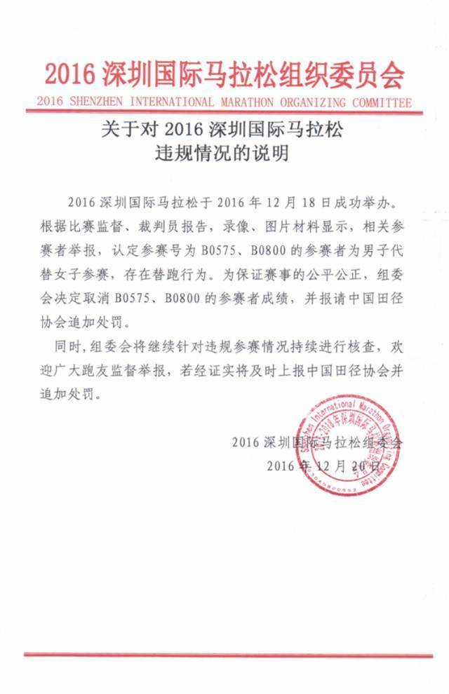 根据录像和图片显示,相关参赛者举报,认定参赛号为B0575、B0800的参赛者为男子代替女子参赛,存在替跑行为。决定取消两名参赛者的成绩,并报请中国田径协会追加处罚。