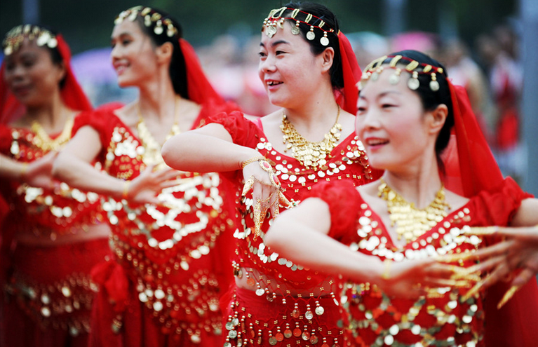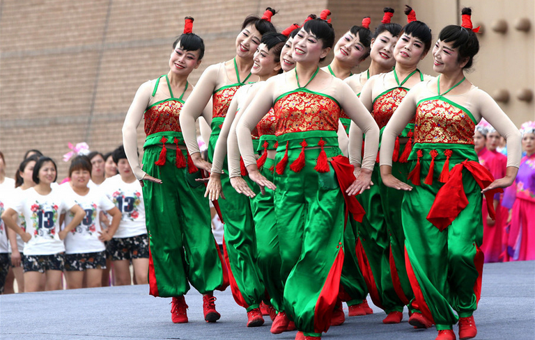2016年8月8日,在安徽省亳州市魏武广场,参赛队员正在表演广场舞。当日,是第8个全国“全民健身日”,安徽省亳州市在魏武广场举行第二届运动会暨安徽省第四届全民健身运动会选拔赛广场健身舞操大赛。民族服饰尽显肤色气质。