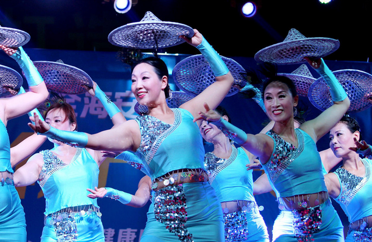 2016年8月19日,江苏省海安县举办第四届广场舞大赛颁奖晚会上,获奖选手在进行广场舞表演。水蓝色的民族服饰尽显阿姨们的好身段。