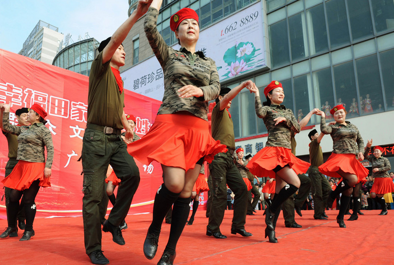 2016年3月27日,辽宁省沈阳市,某商场首届广场舞争霸赛总决赛共有50只队伍闯进总决赛,其中一组大妈身穿迷彩三名大爷身穿军装挥舞红星持枪大跳广场舞,老红军嫦娥俩支队伍服装独特格外抢镜。