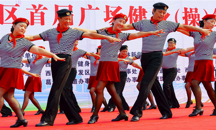 2016年8月22日,北京,社区居民正在表演广场舞《时尚奶奶》。当日,“舞动北京”全民广场舞大赛怀柔区海选比赛暨怀柔区群众舞蹈大赛激情开赛,来自14个乡镇2个街道的32支代表队激情比拼广场舞,700余名群众表演了“我的祖国、时尚奶奶、追梦路上、共舞中国梦”等广场舞。