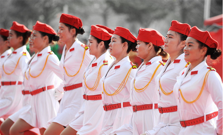 2016年4月27日,安徽淮南市田家庵区社区大妈在广场舞大赛中展示水兵舞。迷彩服红色贝雷帽,尽显大妈飒爽英姿。