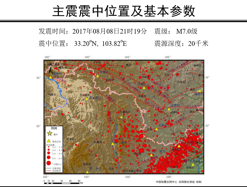 海外网8月8日电,据中国地震台网正式测定,北京时间8月8日21时19分在四川阿坝州九寨沟县(北纬33.20度,东经103.82度)发生7.0级地震,震源深度20千米。震中距九寨沟县39公里、距松潘县66公里、距舟曲县83公里、距若尔盖县90公里,距陇南市105公里,距成都市285公里。