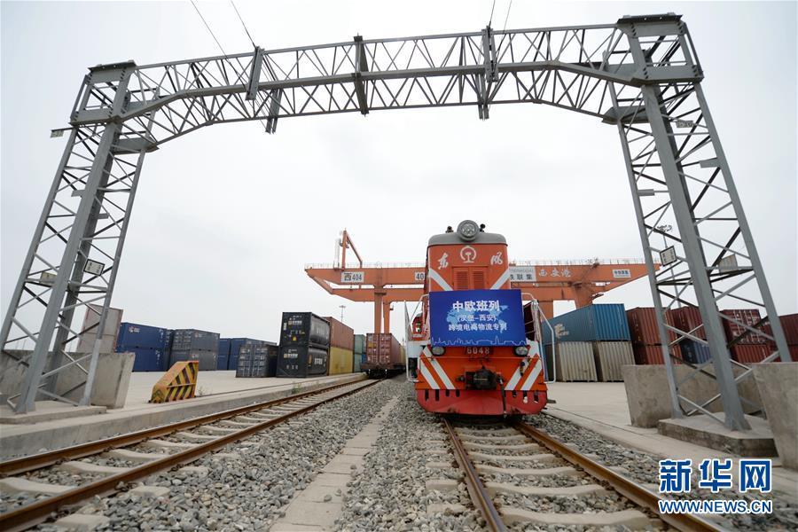 5月21日,“长安号”中欧班列跨境电商物流专列停靠在西安铁路集装箱中心站。当日,始发自德国汉堡的中欧班列“长安号”首趟跨境电商物流专列驶入西安国际港务区西安铁路集装箱中心站。
