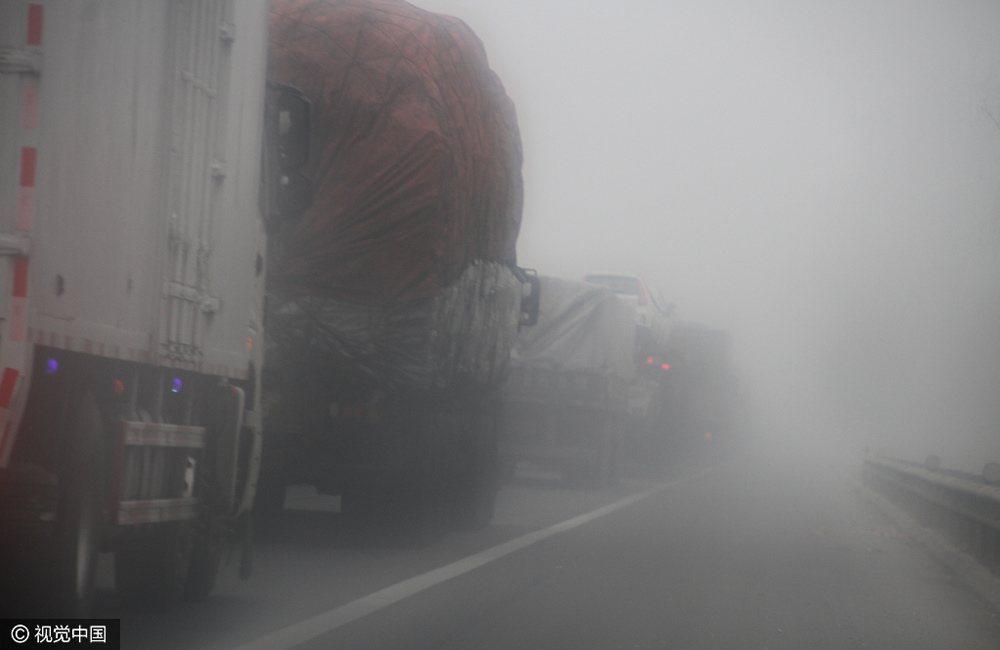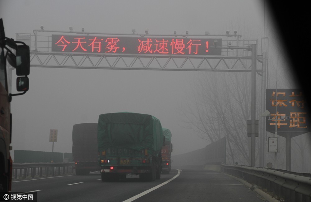 2016年12月20日,山东省菏泽市,严重雾霾再次“封锁”高速公路,菏泽高速交警压车带路冲出雾区。