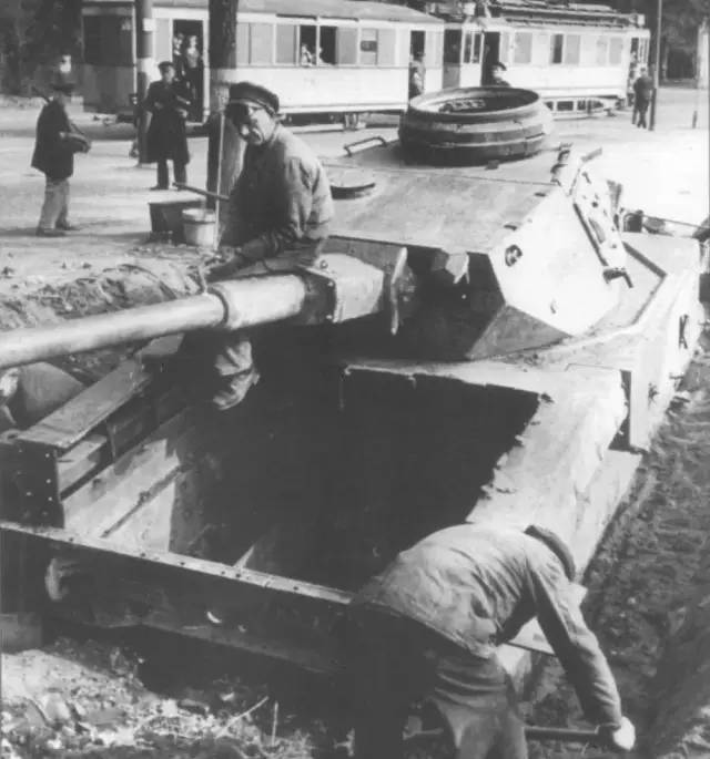 年老的工人挖出充当地堡的“黑豹”坦克。