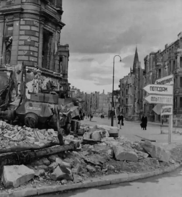 柏林街道两旁都是被击毁的各种军用车辆。