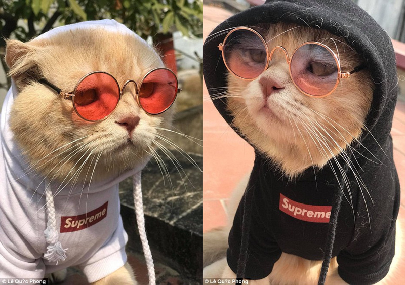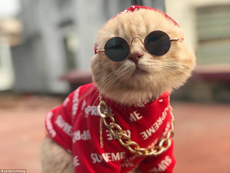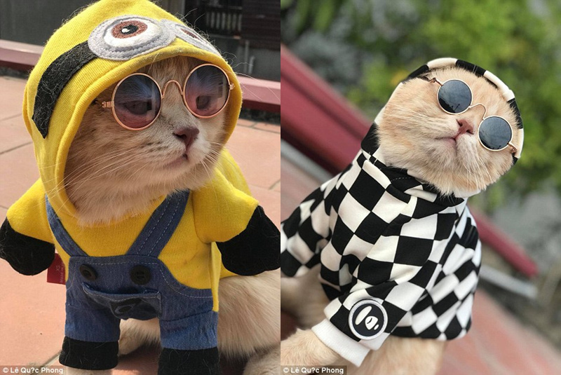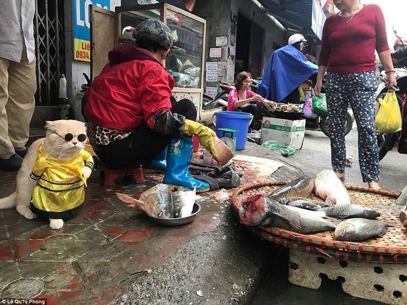 越南海防市的一个农贸市场里,一只名叫Chó的猫站在鱼摊旁边,它穿戴着迷你版的黄袍和帽子。