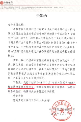 多家支付机构近日已收到中信银行告知函称"将于2018年7月31日关闭直连模式的快捷支付接口"。