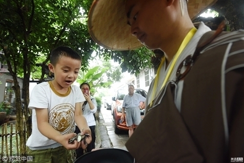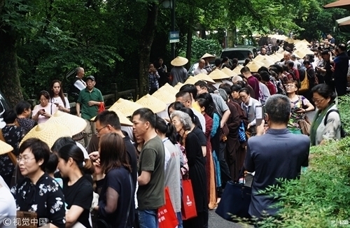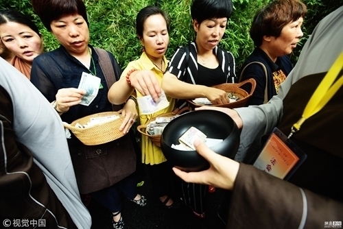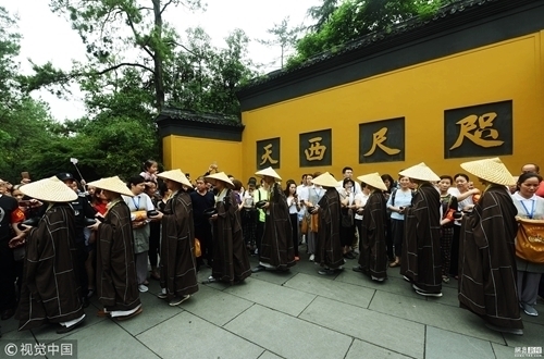 2018年5月22日,杭州,“托钵行脚”的僧人们列队前行,并沿途接纳杭州市民和游客的捐款布施。