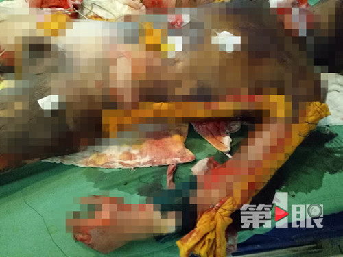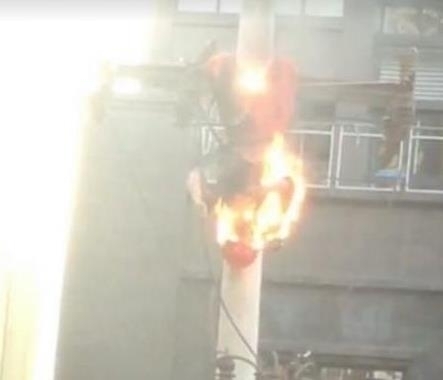 一名电力工人爬上高压电杆进行抢修作业,期间线路突然通电,该工人触电后瞬间被大火笼罩,全身着火被吊在空中。