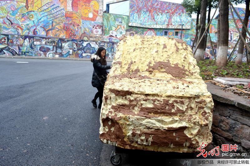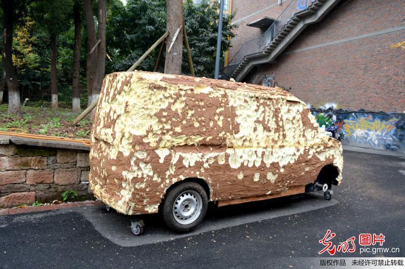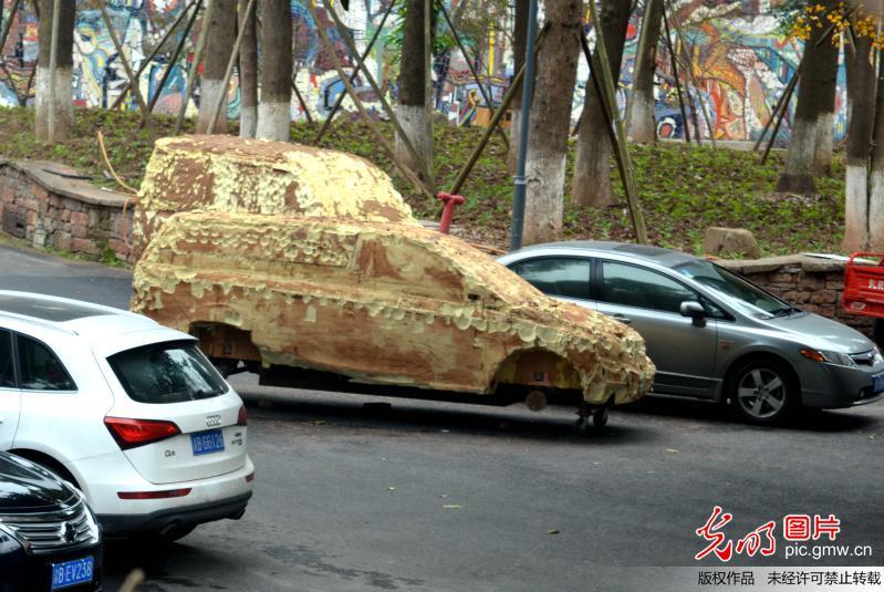 12月2日,重庆,两辆造型逼真的僵尸汽车停靠在路边,部分车轮不再,车体表面看上去锈迹斑斑。