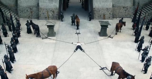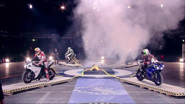 挑战中,4辆摩托车分别拴在大力士的手脚上,由专业摩托车手朝四面反向驾驶,并保证反向拉力在500牛顿以上。
