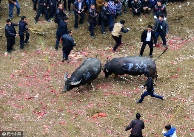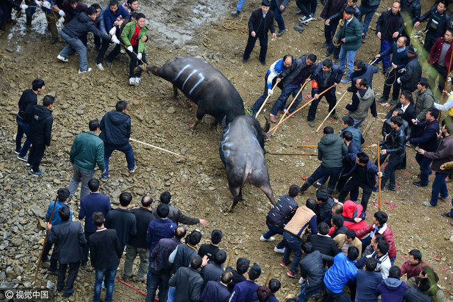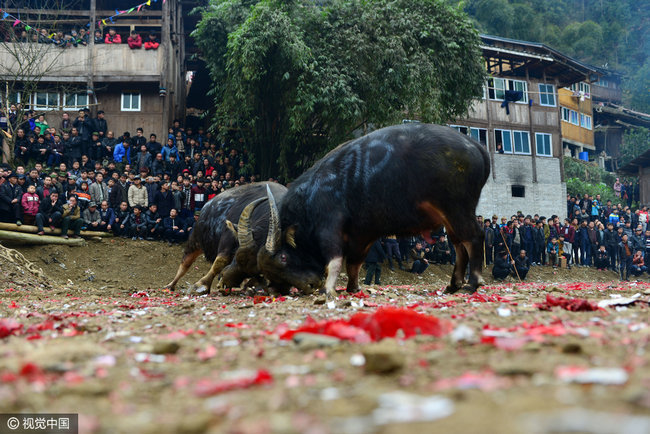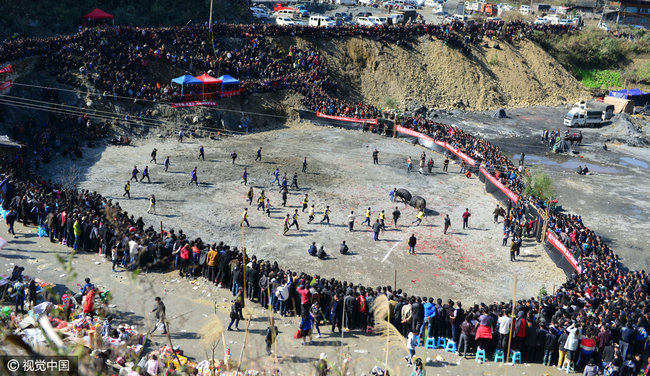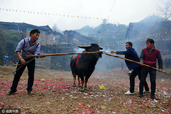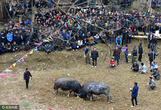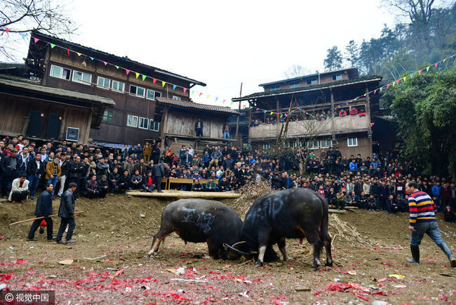 2017年02月04日,贵州省剑河县久仰、柳川等乡镇举行新春传统斗牛民俗活动,吸引了周边村寨的众多村民前来观看,斗牛是当地苗侗同胞世代传承的习俗。