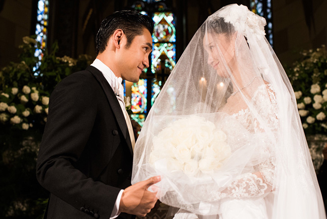 隔着白纱的深情对视,满眼的爱意,谁都能看得到。
