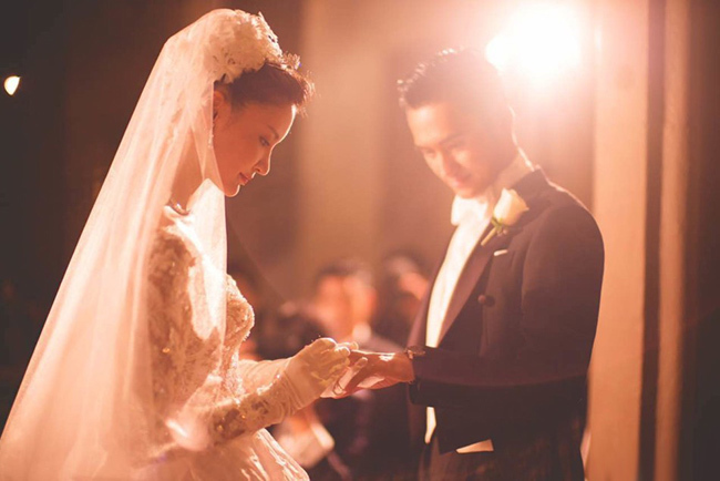 交换结婚戒指,灯光打过来,低头的张歆艺美得像幅画。