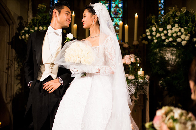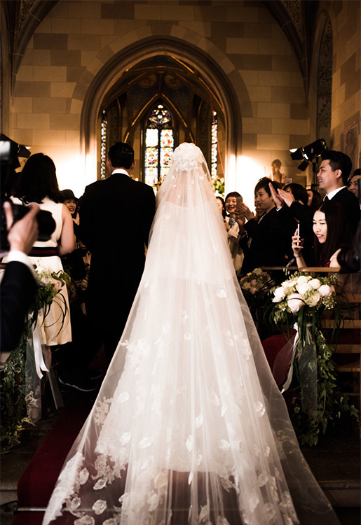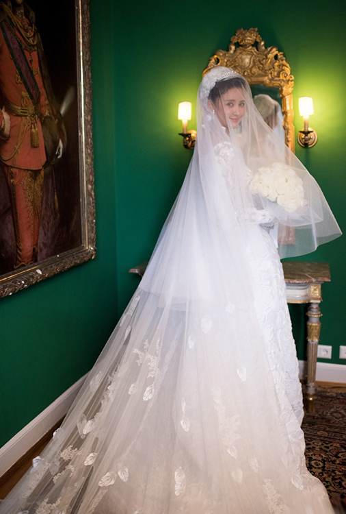 新娘白色婚纱高贵典雅,手里的捧花记得留给胡歌。