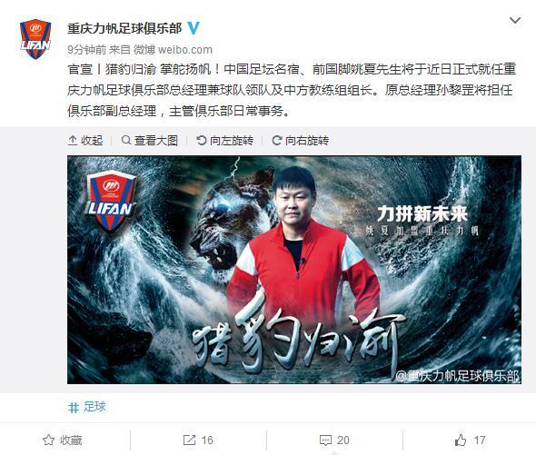 北京时间8月3日,重庆力帆足球俱乐部官方宣布,前四川全兴名将、前国脚姚夏加盟球队,任俱乐部总经理兼球队领队及中方教练组组长。