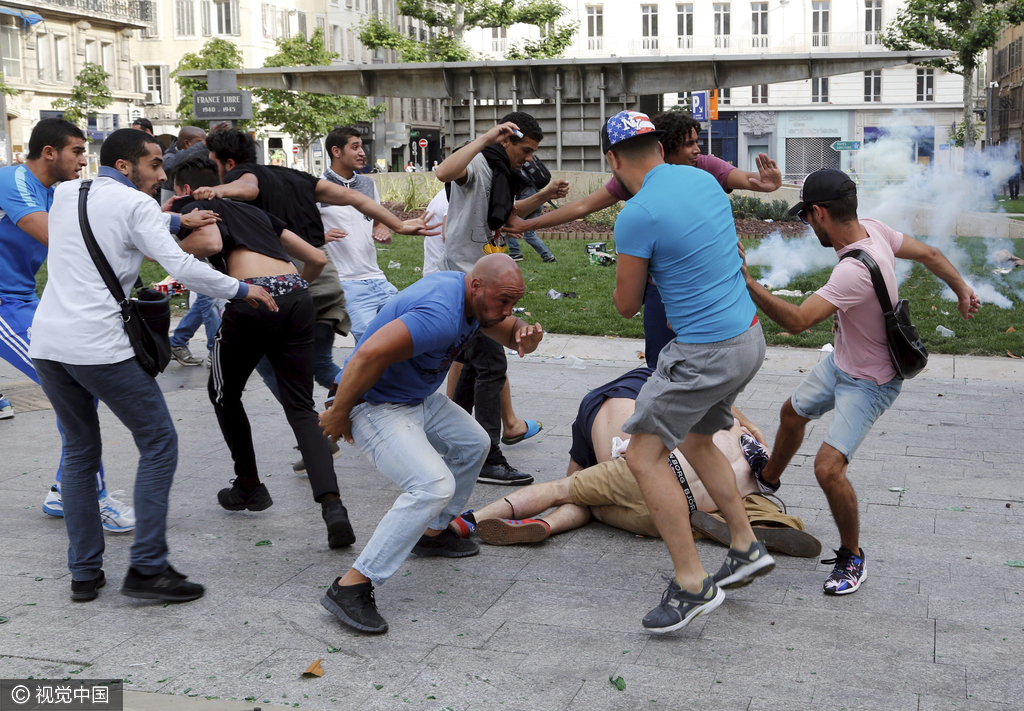 当地时间2016年6月11日,法国马赛,欧洲杯进入第二天,英国和俄罗斯球迷发生冲突,至少造成31人受伤。