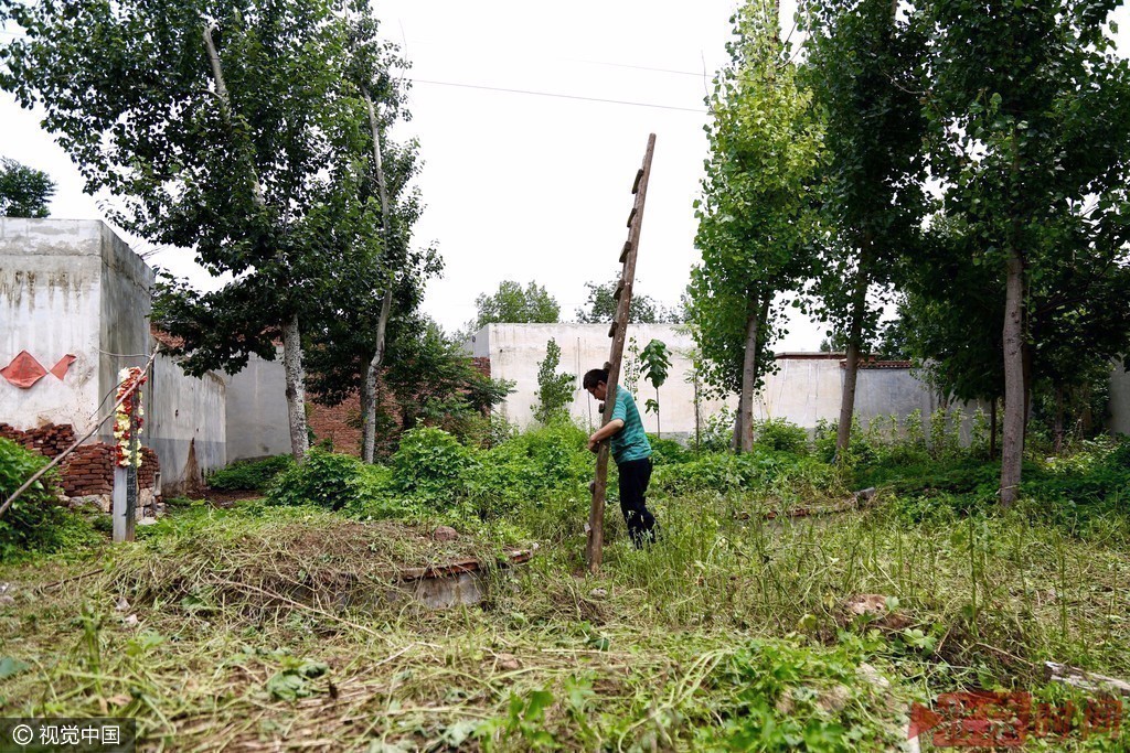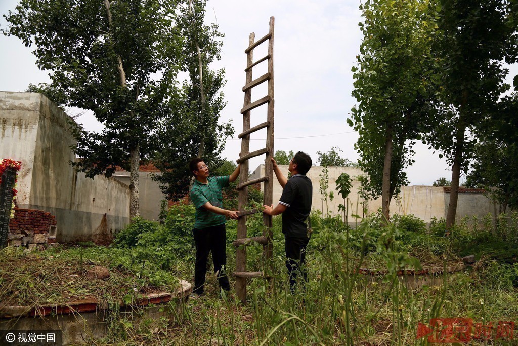 6月24日,河南新乡辉县,竖梯子的位置是大学生“鸟案”第一案发现场。但判决书认定的地方并不在此。