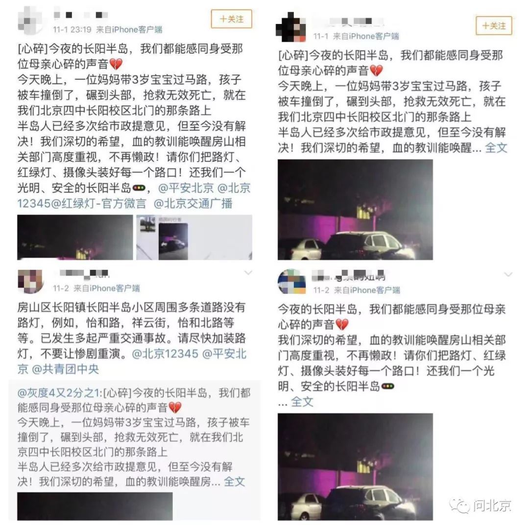 北京新闻广播记者从多条微博上看到,当晚,在北京四中长阳校区北门的怡和北路上,一位妈妈带着3岁的宝宝过马路,孩子被一辆行驶车辆撞倒并碾到头部,抢救无效不幸离世。
